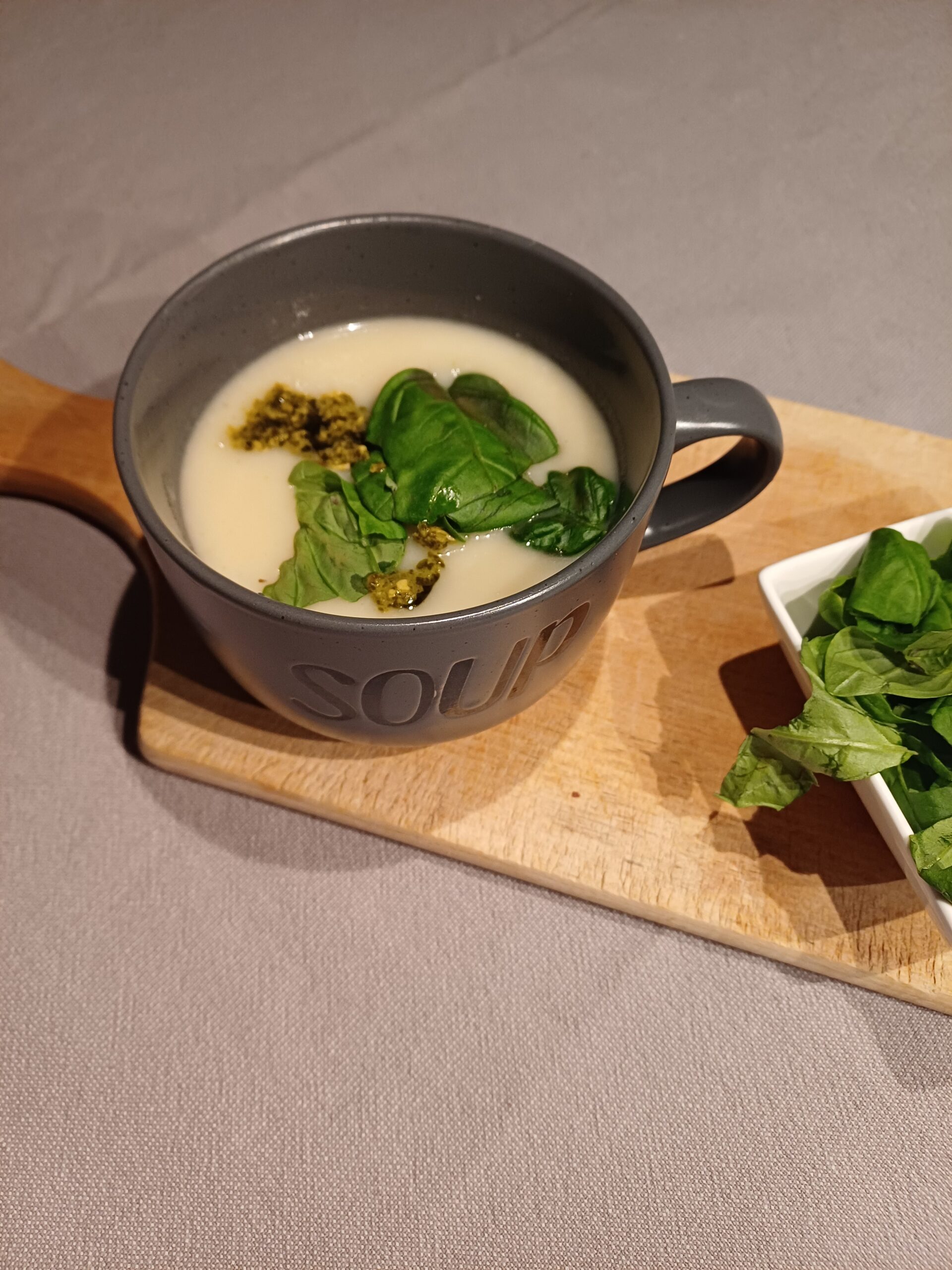 7. Pureer met de staafmixer glad en breng de soep op smaak met peper en eventueel zout. Voeg eventueel extra water toe als de soep te dik is.